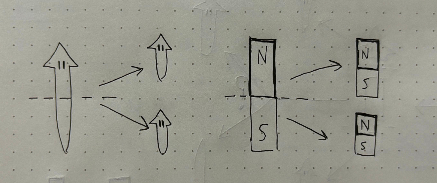 It turns out, unless we interfere in the process, Path A will always win out and the head will grow on the same side as before. In fact, the head and tail of the planaria are somewhat like bar magnets. When a bar magnet is cut in half, you end up with two complete (albeit smaller) bar magnets with the same orientation as the original. Planaria demonstrate a similar feature, in that new fragments retain the axial polarity of the original worm. Even if we cut the worm into multiple mid-sections, it will exhibit a consistent drift back towards the original shape. This original shape is what we will refer to as pattern memory.