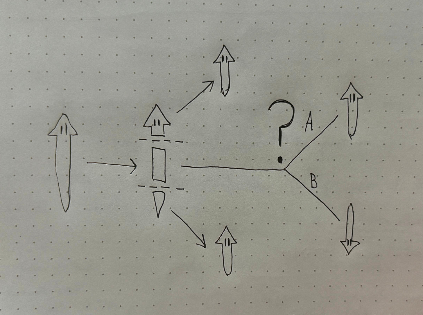 Now, let’s consider a more complex scenario. In the above situation, the worm has one wound on each of the resulting fragments, and each wound will regenerate into either a new head or tail. Now imagine that the worm is split into three pieces, resulting in one head fragment, one tail fragment, and one midsection with no head or tail. The head and tail fragments will behave as seen in our first example, but the midsection offers us a new puzzle. Without a head or a tail to orient itself, will it always regrow a head on the same side as before? A quick sketch will help us visualize the question: